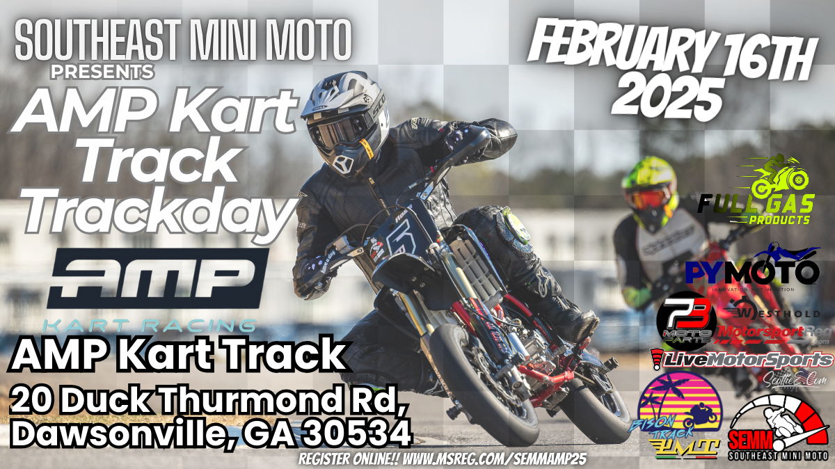 ATTENTION IN THE PADDOCK!! Southeast Mini Moto is excited to offer our first outing at the prestigious Atlanta Motorsports Park Kart Track. This is a limited capacity event of 60 RIDERS. With 4 3x 20 MINUTE SESSIONS of 20 RIDERS There is a max rider capacity on track of 25 riders. This event will be ONLY ONLINE REGISTRATION NO CASH PAYMENTS WILL BE ACCEPTED DAY OF. AMP Kart Track will have a full staff of corner marshals and EMS on hand should the need arise. Southeast Mini Moto is utilizing the Westhold timing and scoring system for the event. If you have your own transponder or even a MyLaps you may use that. If not, don't worry! We will have Westhold transponders for rental during both track day and races.