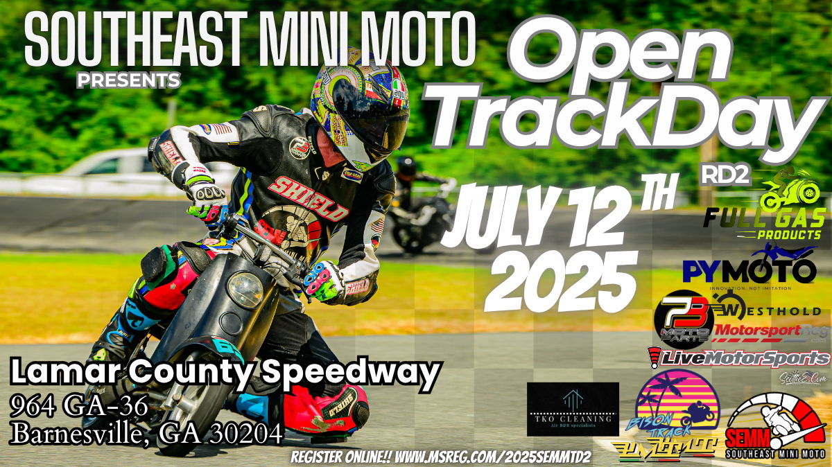 ATTENTION IN THE PADDOCK!! Let's go first call for the 2nd round of the 2025 Southeast Mini Moto Open Track Day Only Event! Southeast Mini Moto will be holding the Open Trackday & Sprint Races at Lamar County Speedway. We have many classes available so there is a class for everyone! (we can and will make extra classes on the day of event if needed so don't leave your Fifty's at home!). Southeast Mini Moto is utilizing the Westhold timing and scoring system for the event, both trackday and races. If you have your own transponder you may use that. If not, don't worry! We will have Westhold transponders for rental during both track day and races. The open trackday is for all ages and skill levels! The Racing is for all ages and skill levels.