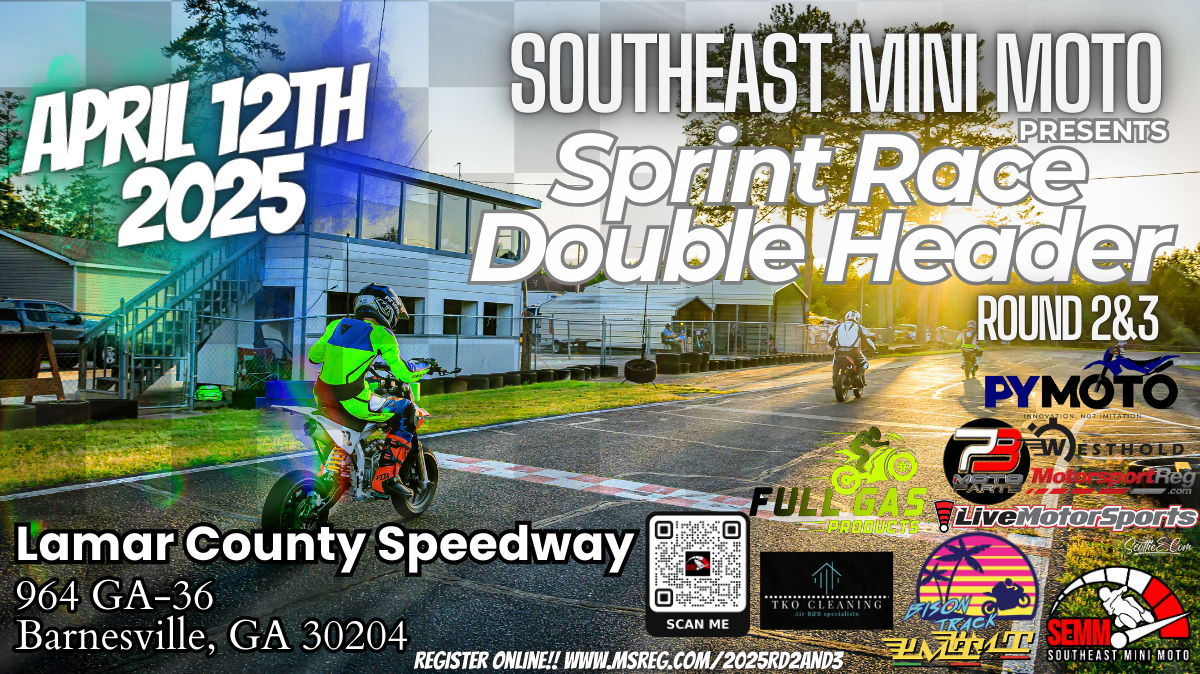 ATTENTION IN THE PADDOCK!! Let's go first call for our first ever Double Header event for 2025 Southeast Mini Moto Sprint Race Series! Southeast Mini Moto will be holding the Open Track Day & Sprint Races at Lamar County Speedway. We have many classes available so there is a class for everyone! (we can and will make extra classes on the day of event if needed so don't leave your Fifty's at home!). Southeast Mini Moto is utilizing the Westhold timing and scoring system for the event, both trackday and races. If you have your own transponder you may use that. If not, don't worry! We will have Westhold transponders for rental during both track day and races. The open trackday is for all ages and skill levels! The Racing is for all ages and skill levels.