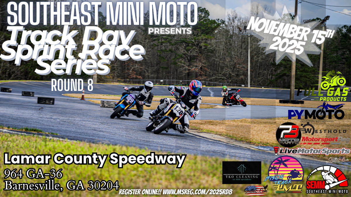 ATTENTION IN THE PADDOCK!! Let's go first call for the 8th round of the 2025 Southeast Mini Moto Open Trackday + Sprint Racing Series! Southeast Mini Moto will be holding the Open Trackday & Sprint Races at Lamar County Speedway. We have many classes available so there is a class for everyone! (we can and will make extra classes on the day of event if needed so don't leave your Fifty's at home!). Southeast Mini Moto is utilizing the Westhold timing and scoring system for the event, both trackday and races. If you have your own transponder you may use that. If not, don't worry! We will have Westhold transponders for rental during both track day and races. The open trackday is for all ages and skill levels! The Racing is for all ages and skill levels.
