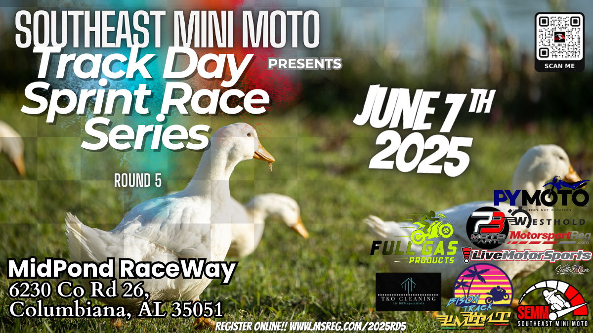 ATTENTION IN THE PADDOCK!! Let's go first call for the 5th round of the 2025 Southeast Mini Moto Open Trackday + Sprint Racing Series! Southeast Mini Moto will be holding the Open Trackday & Sprint Races at MidPond Raceway. We have many classes available so there is a class for everyone! (we can and will make extra classes on the day of event if needed so don't leave your Fifty's at home!). Southeast Mini Moto is utilizing the Westhold timing and scoring system for the event, both trackday and races. If you have your own transponder you may use that. If not, don't worry! We will have Westhold transponders for rental during both track day and races. The open trackday is for all ages and skill levels! The Racing is for all ages and skill levels.