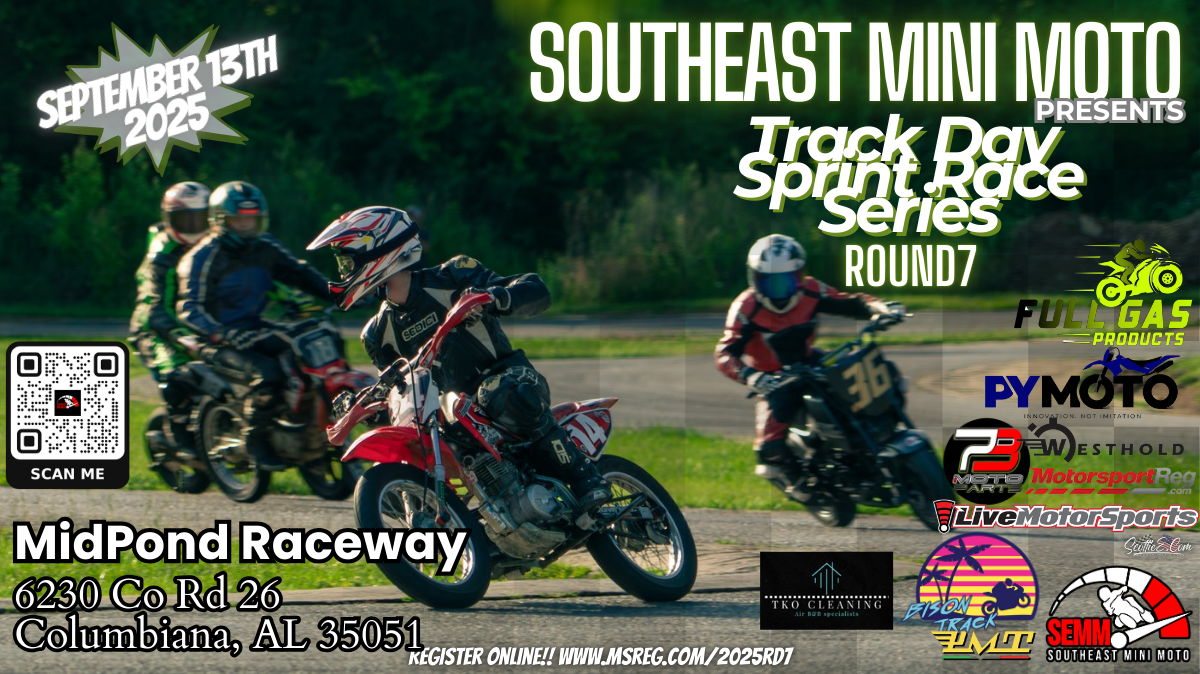 ATTENTION IN THE PADDOCK!! Let's go first call for the 7th round of the 2025 Southeast Mini Moto Open Trackday + Sprint Racing Series! Southeast Mini Moto will be holding the Open Trackday & Sprint Races at MidPond Raceway. We have many classes available so there is a class for everyone! (we can and will make extra classes on the day of event if needed so don't leave your Fifty's at home!). Southeast Mini Moto is utilizing the Westhold timing and scoring system for the event, both trackday and races. If you have your own transponder you may use that. If not, don't worry! We will have Westhold transponders for rental during both track day and races. The open trackday is for all ages and skill levels! The Racing is for all ages and skill levels.